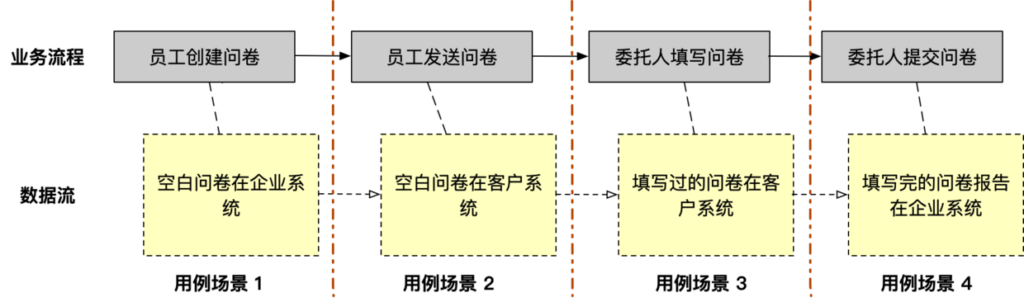 实例: 员工在企业系统创建空白问卷,发送给委托人,委托人可以在用户系统看到问卷并填写,填写完毕提交后,员工可以在企业系统看到填完的问卷报告。业务流程和数据流如下图所示,根据前面描述的方法可以切分出四个用例场景。