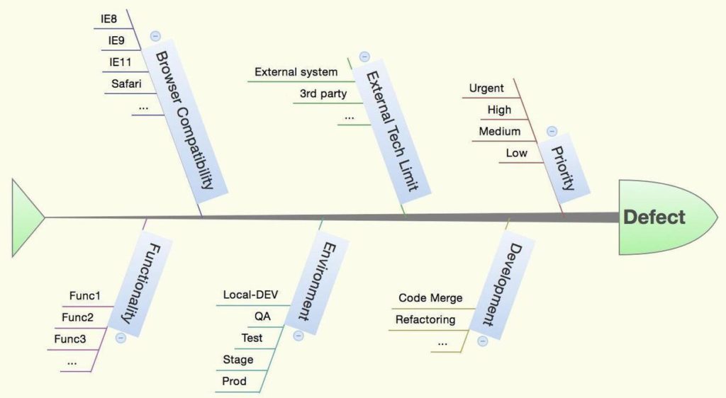 比较推荐的一种缺陷分析方法是鱼骨图分析法,可以将跟缺陷相关的各个因素填写到鱼骨图里,对缺陷进行分析,如下图示: