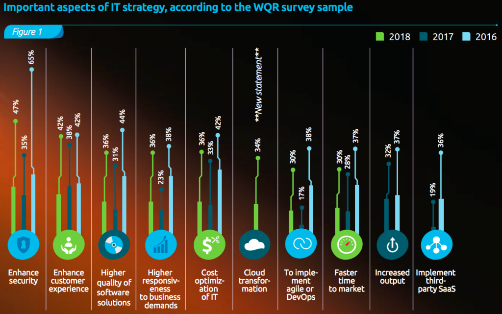 - 数字化转型、迁移到云、敏捷和DevOps的采纳、质量保障和测试中自动化和分析技术的运用,使得在新的基础设施、工具、组织改组、工作流程重组方面的花销达到高峰