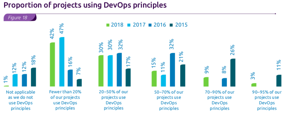“速度上的质量”宣言推动着敏捷和DevOps逐渐被采用,有多达99%的受访者称他们至少有一些项目在采用DevOps。但是,有些组织以质量为代价去追求速度,这样是不妥的。也有的组织认为敏捷与瀑布共存的模式比较适合他们的组织、文化和业务的需求。