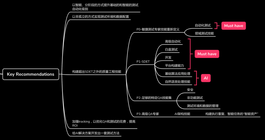- 第二优先级是吸引SDET,他们的必备技能要求有高级自动化测试、白盒测试、开发和平台构建能力,同时最好还有AI应用的基础算法应用能力和自然语言处理技能;