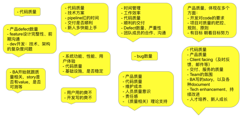 问:谁应该为质量负责? 答:QA是负责测试把关,主要负责吧,DEV也要在设计和代码上对质量负责。 问:那其他角色呢? 答:BA还好吧,跟质量的关系没那么大。 ……