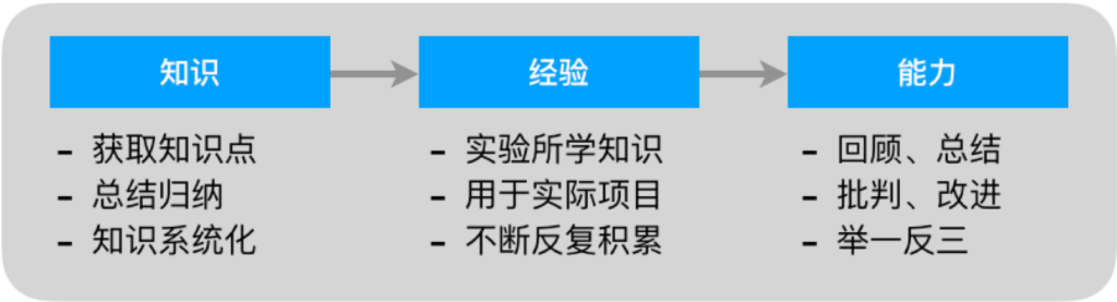 前面每个阶段都可以获取新的知识,然后经历同样的知识-经验-能力的转变,不断的积累,将会实现能力的提升;每个阶段都可以把知识或经验分享给他人,在帮助他人获得相应知识的同时,更是自身能力提升的一个非常好的方式。