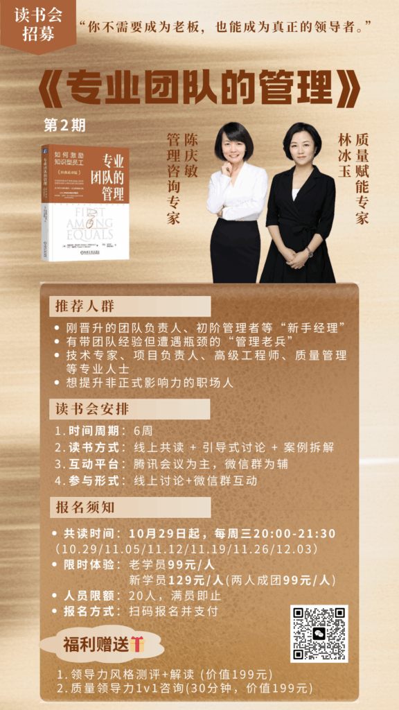其实都来自一本我非常推荐的管理书籍,叫《专业团队的管理》。这不是一本传统的“企业领导力”书,而是专门写给在专业型组织中、没有正式权力但承担关键责任的人——比如你我这样的质量人。